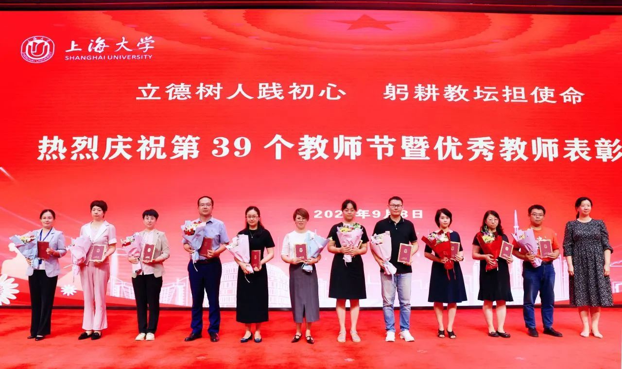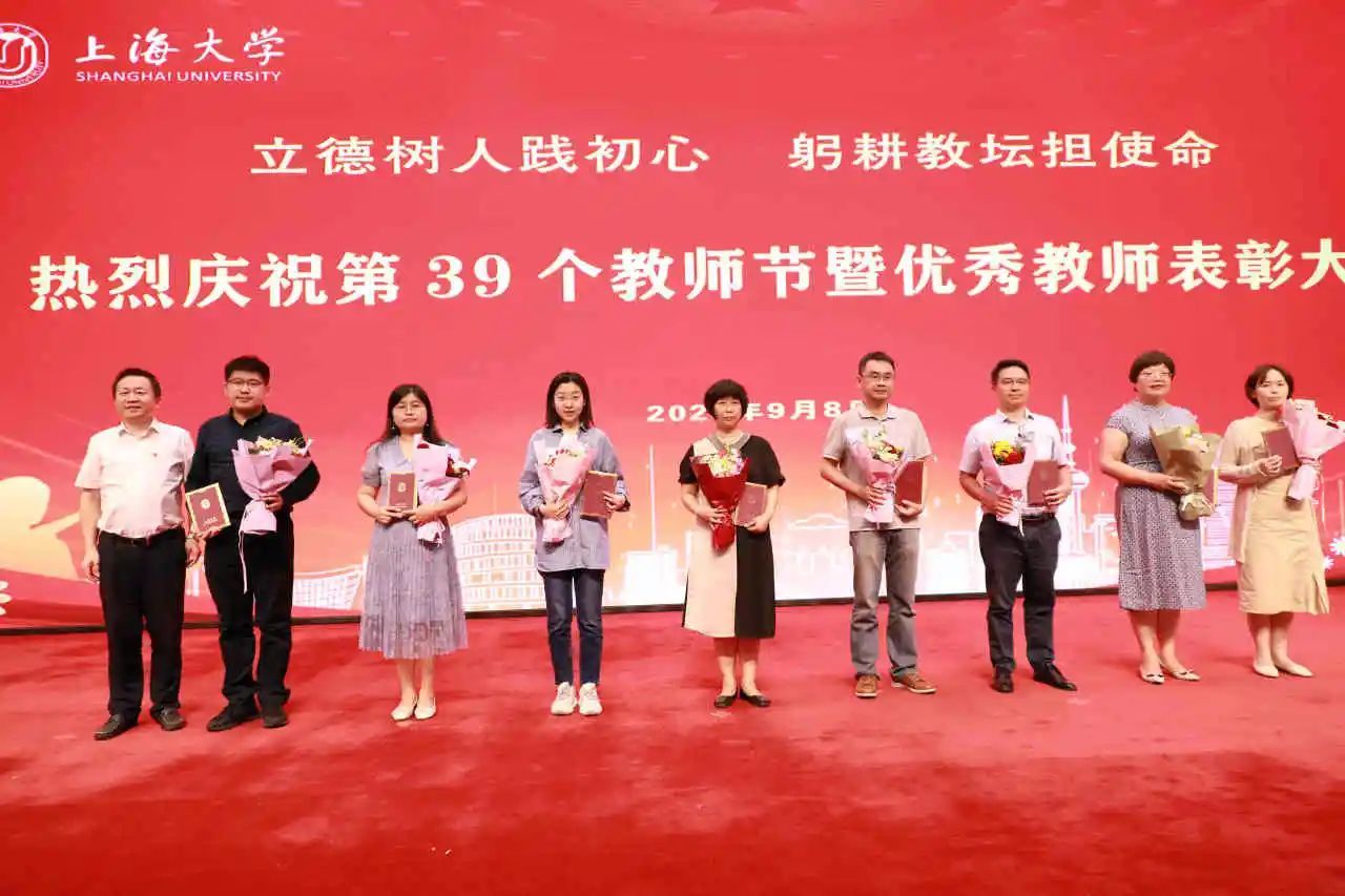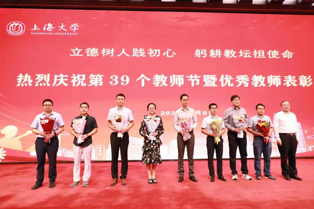 新进教师代表为从教三十年教师代表献花,学习他们矢志不渝为教育事业殚精竭虑的品格。从教三十年教师代表为新进教师代表赠送校徽,鼓励他们传承上大自强不息的精神,爱岗敬业、潜心育人。