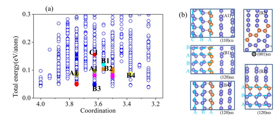 图 1 (a) 高通量计算得到的4000个结构的能量与配位数分布图(b)5种亚稳的双相异质节,图中虚线为金刚石密排面,即HD(001), CD(111); B2中界面与密排面垂直;橙色标记界面原子。