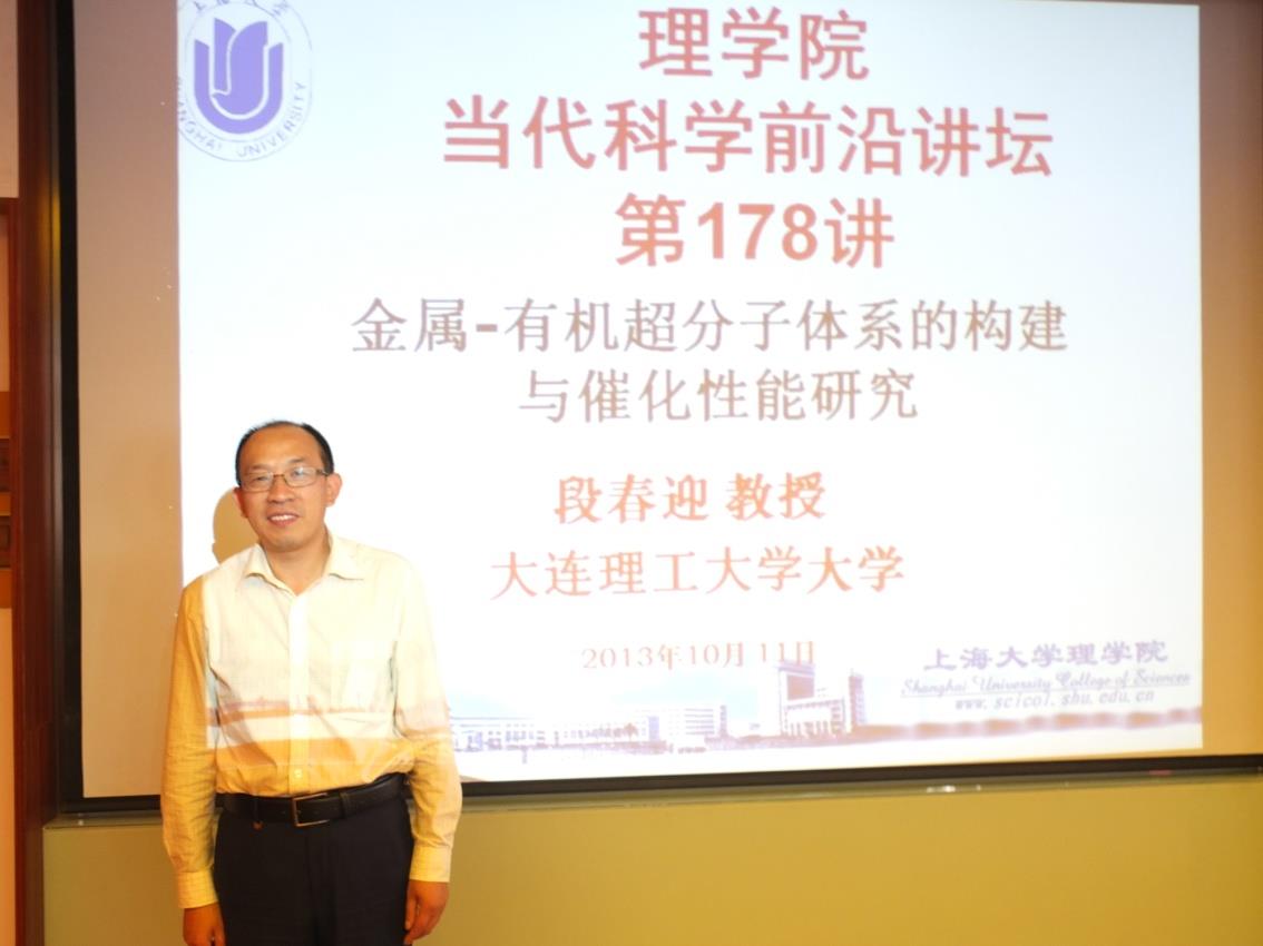 段春迎教授于11日上午在G507报告厅做了理学院“当代科学前沿讲坛”第178讲: 金属-有机超分子体系的构建与催化性能研究”。学术报告由李明星、朱守荣教授共同主持。来自化学系无机化学、有机化学等专业的四十余名教师和研究生参加了此次学术报告。