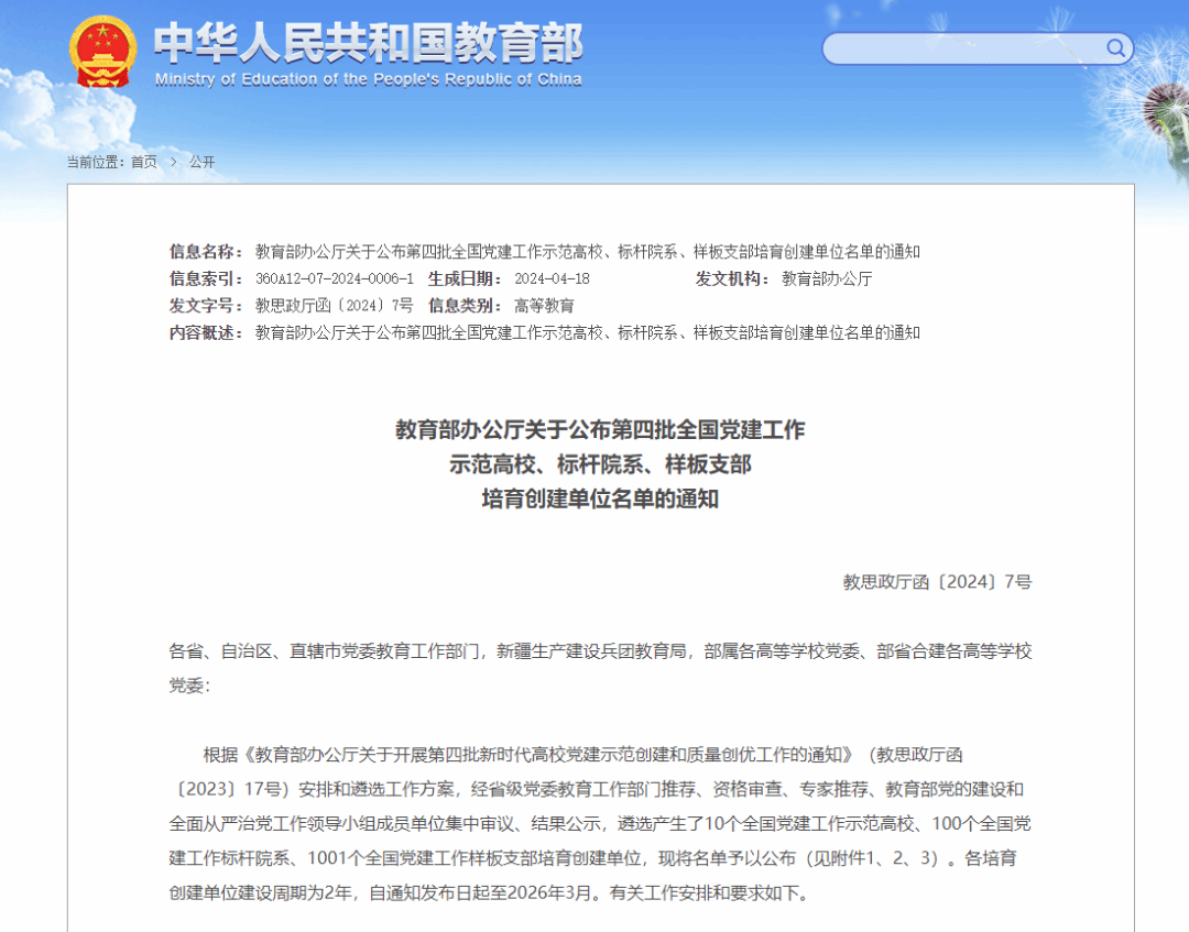 近日,《教育部办公厅关于公布第四批全国党建工作示范高校、标杆院系、样板支部培育创建单位名单的通知》(教思政厅函〔2024〕7号)和《教育部办公厅关于公布第三批全国高校“百个研究生样板党支部”和“百名研究生党员标兵”创建名单的通知》(教思政厅函〔2024〕8号)公布。